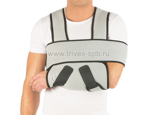 - состоит из муфты для оптимального размещения верхней конечности в функционально выгодном положении и съемного пояса для надежной фиксации верхней конечности к туловищу